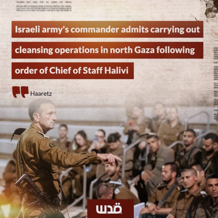 Secondo Haaretz, il comandante della 162ª divisione dell’esercito di occupazione israeliano ha ammesso di aver condotto operazioni di “pulizia” contro i palestinesi nel nord di Gaza, impedendone il ritorno in base agli ordini del capo di stato maggiore Herzi Halevi, del Comando meridionale e della leadership politica di Netanyahu.