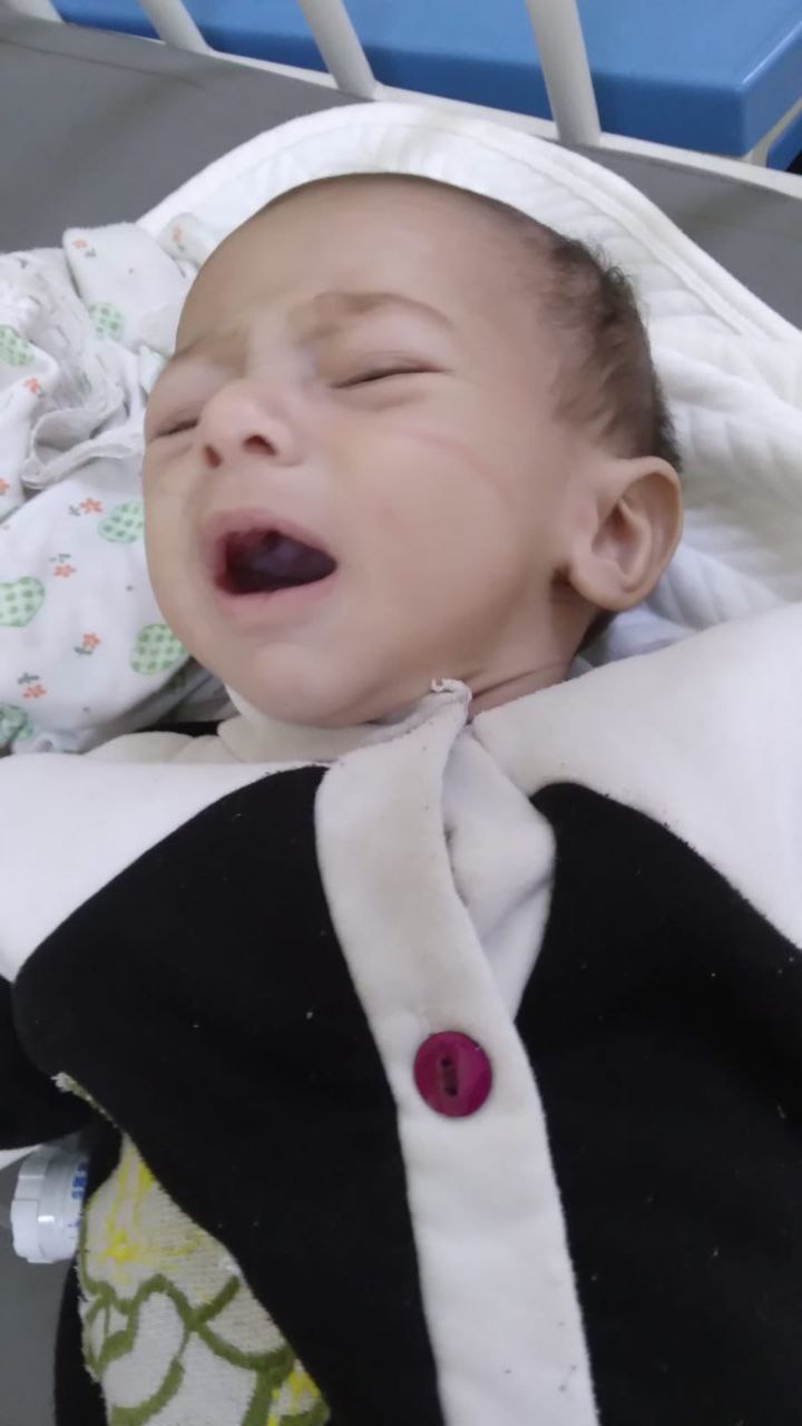 (Foto: Ali pesava 6 kg prima del 7 ottobre, ora il suo peso è sceso a 4 kg a causa della grave malnutrizione e disidratazione. Decine di migliaia di neonati e bambini a Gaza corrono un grave rischio di morte per disidratazione e malnutrizione a causa dell’assedio israeliano).