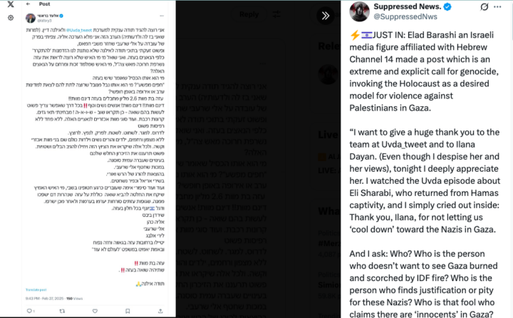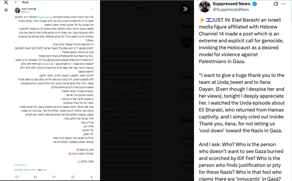 Gaza. Un post sui social media recentemente riesumato appartenente a Elad Barashi, produttore israeliano associato al Canale 14, ha scatenato l’indignazione e la condanna pubblica per aver invocato l’Olocausto contro i 2,3 milioni di abitanti di Gaza.