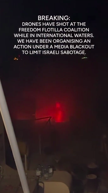 Uno degli attivisti internazionali ha anche pubblicato un filmato che conferma che la nave è stata presa di mira da due droni e ha lanciato una richiesta di soccorso urgente.