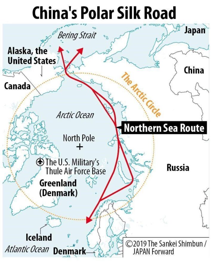 L’esperto militare cinese Yu Chun ha osservato che “presto dovrebbe aprirsi la tanto desiderata ‘via d’acqua dorata’ dell’Oceano Artico, che permetterà alle navi di attraversare l’Oceano Pacifico e di navigare lungo le coste settentrionali del Nord America e dell’Eurasia fino all’Oceano Atlantico”.