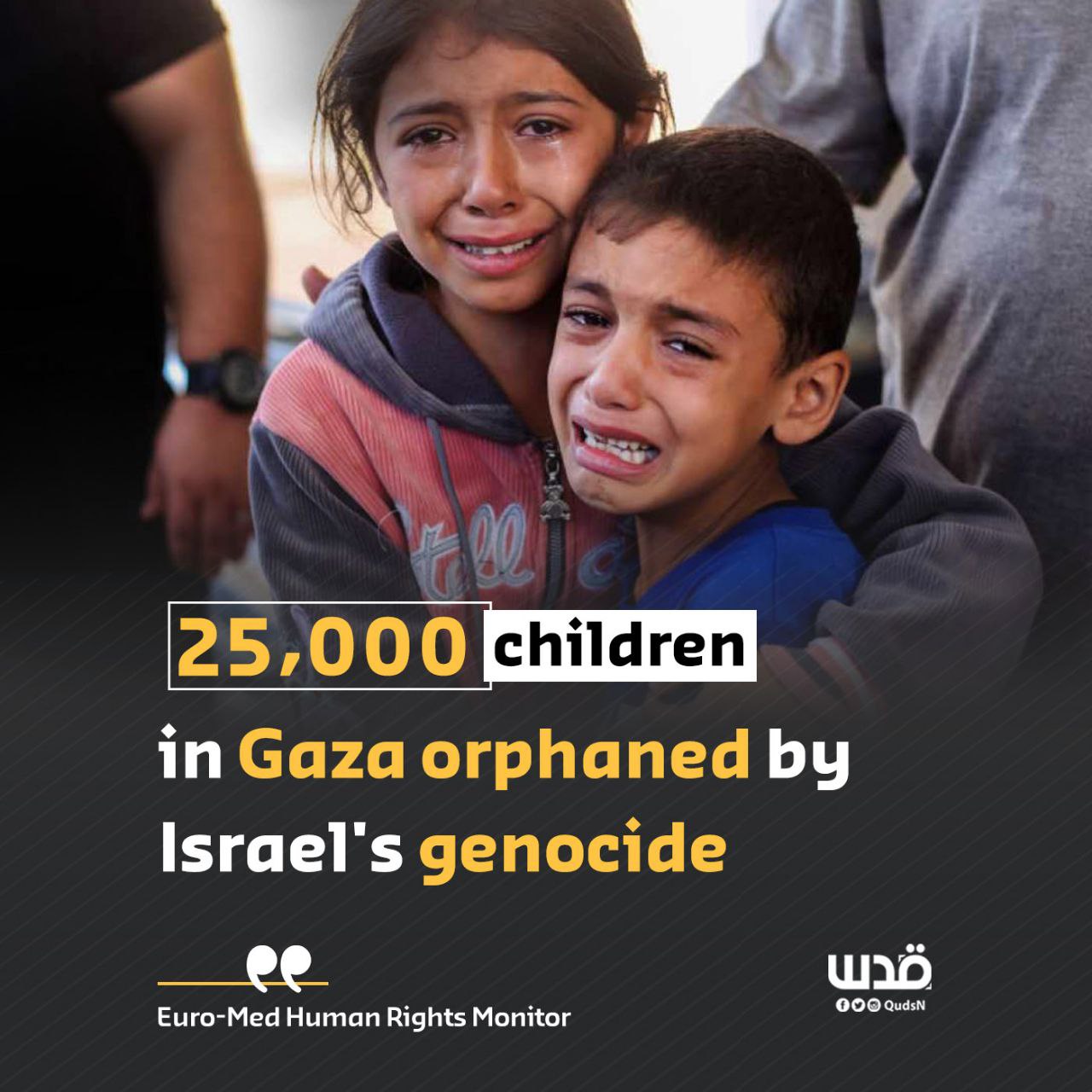 Secondo Euro-Med, oltre 25.000 bambini a Gaza hanno perso uno o entrambi i genitori a causa del genocidio israeliano in corso.