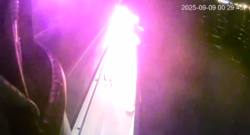 Video diffusi dagli attivisti mostrano un’imbarcazione in mare con un oggetto in fiamme che cade dall’alto, incendiando una parte dell’imbarcazione.