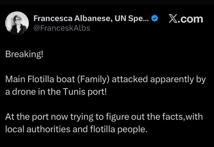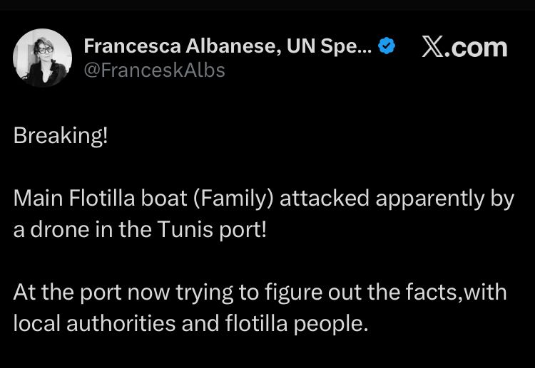 Al contrario, la Relatrice Speciale delle Nazioni Unite Francesca Albanese ha dichiarato su X che la causa più probabile è stato un attacco con un drone. Ha aggiunto che altre due imbarcazioni in rotta verso la Tunisia necessitano urgentemente di protezione.