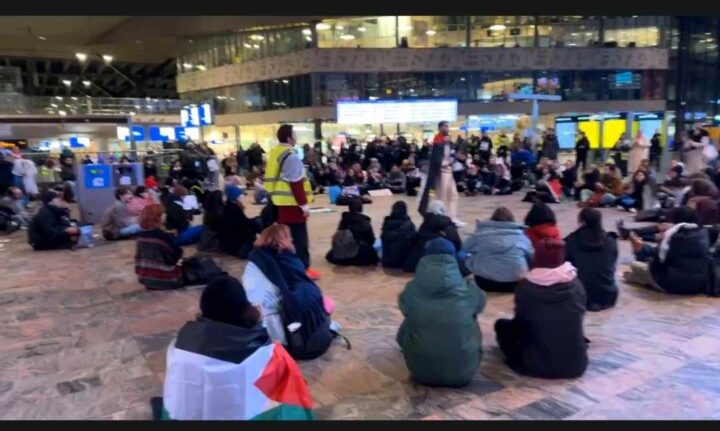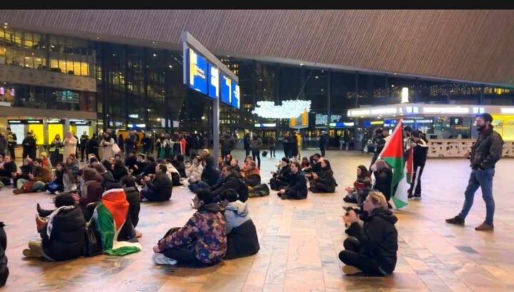 Sit-in di protesta all’interno della stazione ferroviaria principale della città di Rotterdam, Olanda, in solidarietà con la Palestina. Crediti: Centro europeo dei media palestinesi