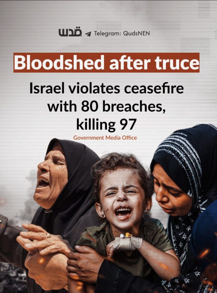 Secondo l’ufficio stampa del governo di Gaza, Israele ha commesso 80 violazioni dall’inizio del cessate il fuoco, provocando 97 morti e 230 feriti, tra cui 21 violazioni registrate solo domenica.