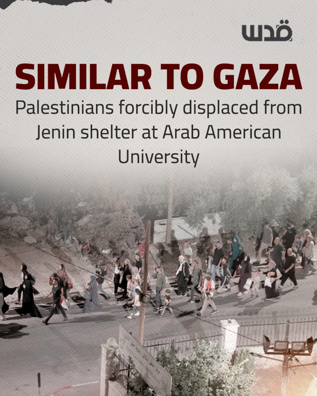 Jenin. Centinaia di palestinesi sfollati a causa degli attacchi dell’esercito israeliano al campo profughi di Jenin, nella Cisgiordania occupata, si sono rifugiati nel campus dell’Università Araba Americana, in città.