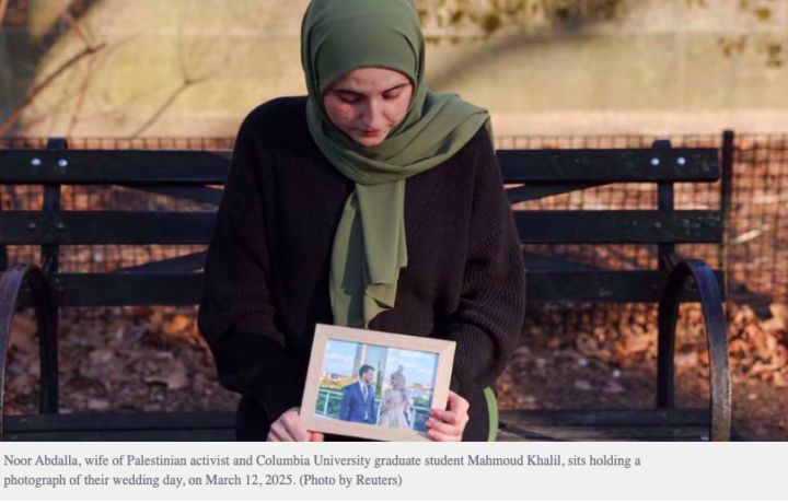 New York. Noor Abdalla, moglie di Mahmoud Khalil, laureato alla Columbia University, arrestato dagli agenti dell’ICE a causa del suo attivismo pro-palestinese nel campus, ha dichiarato che suo marito è “palestinese e sta difendendo il suo popolo”. Il governo ha annunciato di aver avviato un procedimento per deportarlo a causa del suo attivismo.