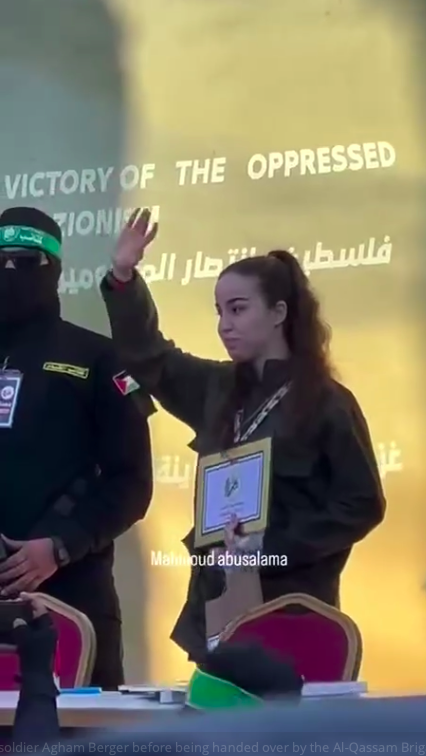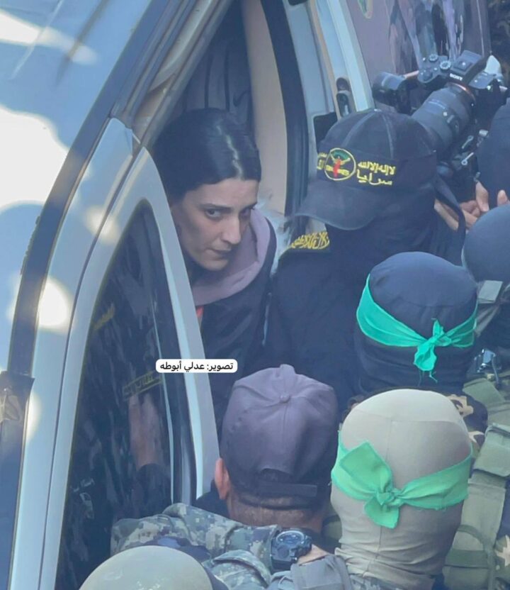 Gli ultimi momenti della soldatessa israeliana Agham Berger prima di essere consegnata dalle Brigate Al-Qassam alla Croce Rossa nel campo profughi di Jabalia, nel nord di Gaza.