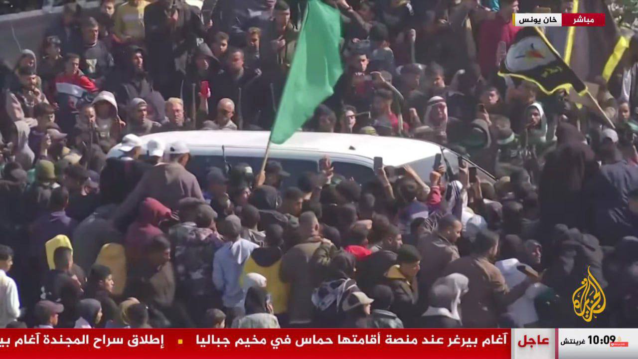 Due prigionieri israeliani e cinque cittadini thailandesi sono arrivati ​​per essere consegnati alla Croce Rossa a Khan Younis, nella striscia di Gaza meridionale, nell’ambito del terzo scambio di prigionieri dall’entrata in vigore del cessate il fuoco.