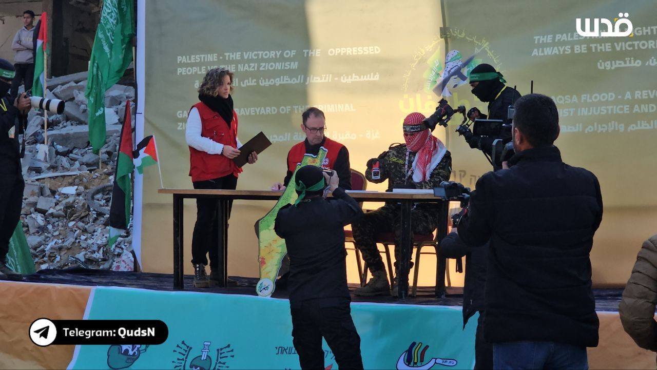 La resistenza ha allestito una piattaforma, come aveva fatto durante la seconda operazione di consegna, e vi ha collocato un grande striscione che riportava frasi come: “La resistenza ha sconfitto Givati”, in riferimento alla Brigata d’élite Givati ​​che perse decine di soldati e alcuni dei suoi leader durante le battaglie di Jabalia.