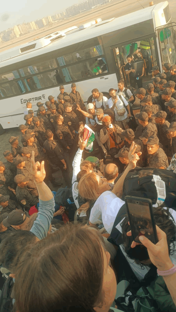 Martedì, anche due algerini sono stati fermati ed espulsi. Mercoledì, la tensione è ulteriormente aumentata dopo che una donna ha rivelato di essere venuta per partecipare alla marcia pacifica. In seguito alla sua dichiarazione, molti altri viaggiatori sono stati espulsi. Gli agenti egiziani hanno iniziato a urlare contro i passeggeri e, a quanto pare, hanno minacciato alcuni di detenzione a tempo indeterminato. Molti hanno scelto di tornare volontariamente per paura.