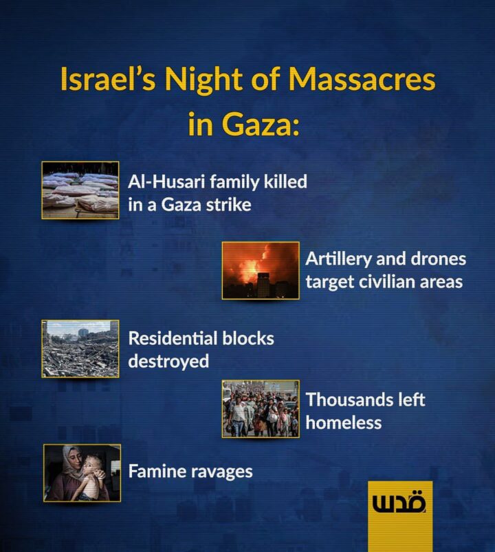 La città di Gaza ha vissuto una notte di sangue a seguito di incessanti attacchi israeliani, tra cui il massacro della famiglia Al-Husari che ha causato numerose vittime civili. Nel frattempo, bombardamenti di artiglieria hanno preso di mira aree civili e missili di grandi dimensioni hanno raso al suolo isolati residenziali, lasciando migliaia di persone senza casa e senza riparo.