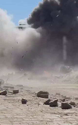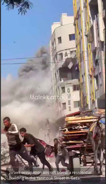 Un aereo d’occupazione israeliano bombarda un edificio residenziale in via Yarmouk a Gaza.