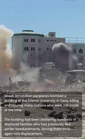 Numerosi palestinesi sono stati uccisi e feriti in un orribile massacro commesso dalle forze di occupazione israeliane, bombardando per la terza volta l’Università islamica mentre era gremita di civili a Gaza.