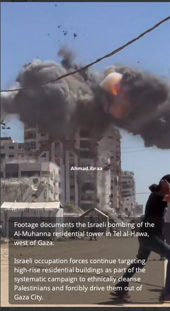 Un filmato documenta il bombardamento israeliano del grattacielo residenziale Al-Muhanna a Tel al-Hawa, a ovest della città di Gaza.
