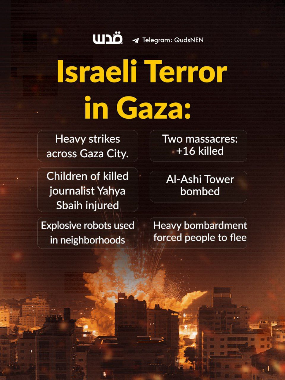 Distruzione sistematica degli edifici della città di Gaza: 16 edifici, 2 torri residenziali e decine di tende.