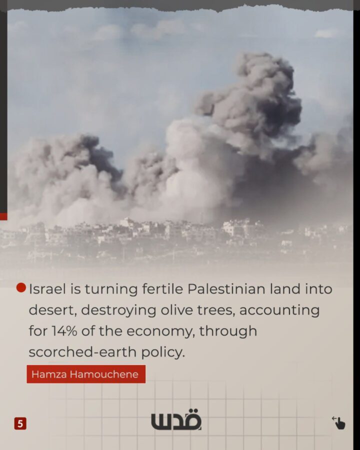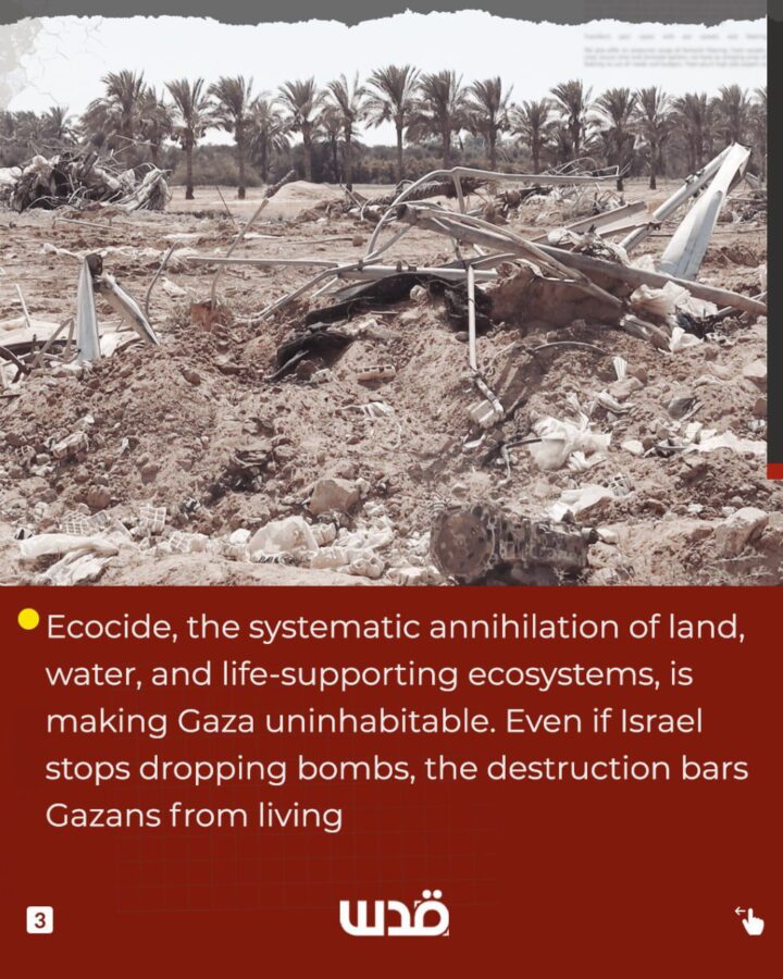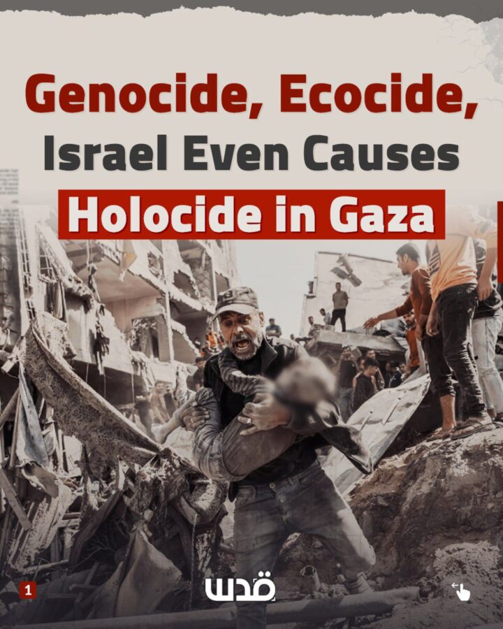 Israele sta commettendo più di un genocidio a Gaza. È quello che gli osservatori hanno descritto come “olocidio”, la totale cancellazione della vita, della cultura e dell’ecologia di un’intera popolazione. Anche in assenza di una legge internazionale contro l’ecocidio, le atrocità israeliane contro i residenti e la loro terra violano l’articolo 8 dello Statuto di Roma.
