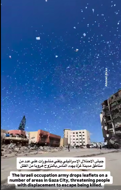 L’esercito israeliano ha lanciato volantini, questa mattina, chiedendo a coloro che si trovano ancora nella città di Gaza di spostarsi immediatamente a sud, avvertendo che la città e l’intera regione settentrionale sono estremamente pericolose.
