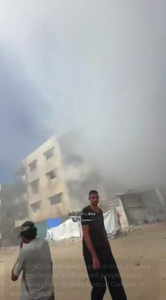 I droni quadricotteri israeliani hanno sganciato bombe di gas tossico sulle tende e sulle case degli sfollati nei pressi del complesso medico Al-Shifa, nella parte occidentale della città di Gaza.