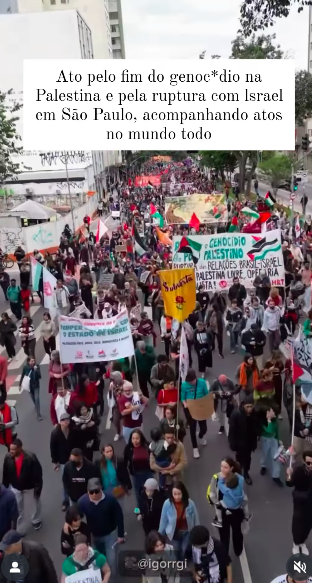 Il corteo è partito da Piazza Roosevelt e si è spostato lungo l’Avenida Paulista, con i manifestanti che hanno denunciato i crimini di Israele e chiesto la rottura di ogni relazione politica, economica e culturale con il Paese.