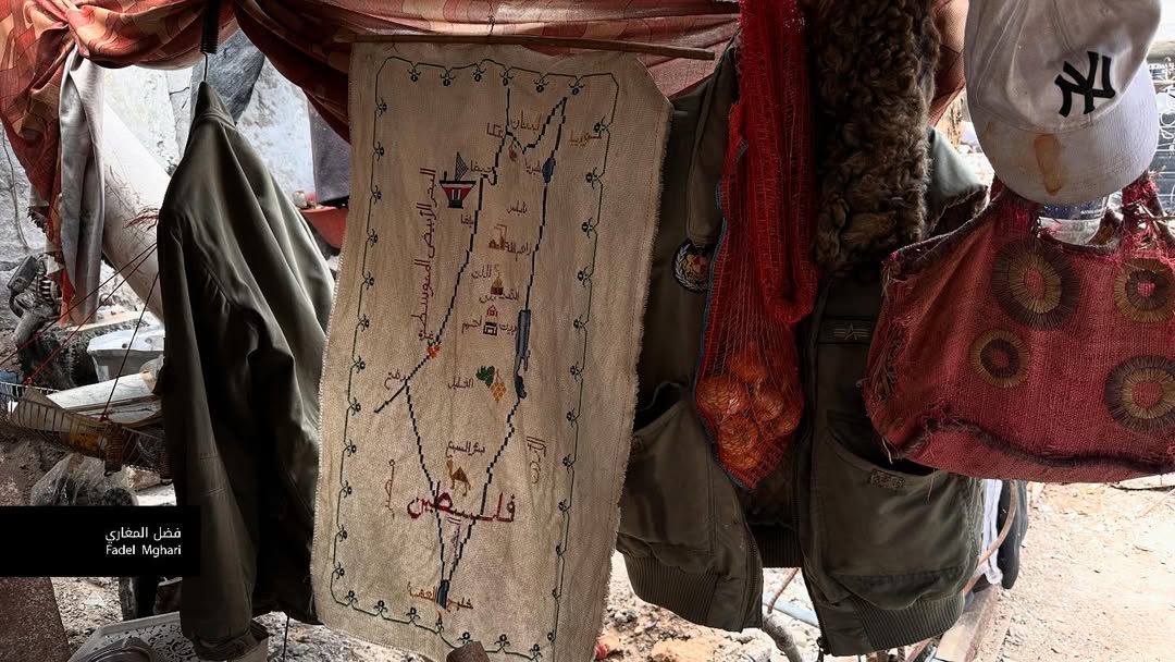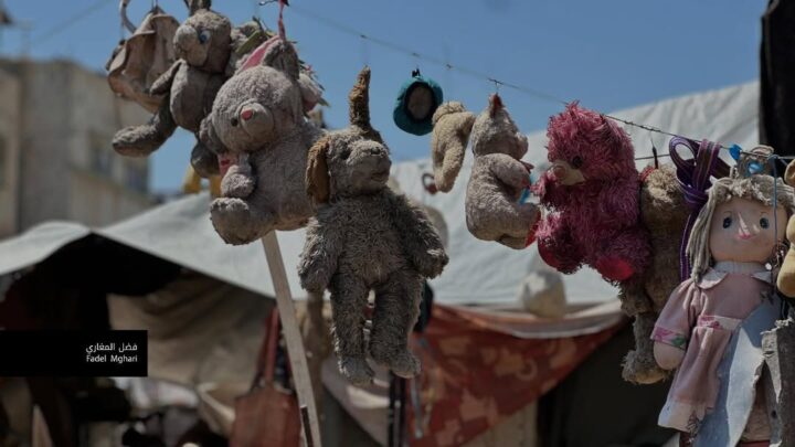 Un giovane della famiglia Washah ha recuperato i giocattoli e i vestiti dei suoi figli, insieme a quelli dei familiari uccisi, da sotto le macerie della loro casa bombardata dall’occupazione israeliana nel campo di Al-Bureij. Li mette davanti alla sua tenda in loro memoria.