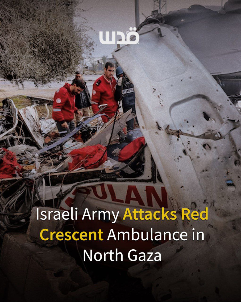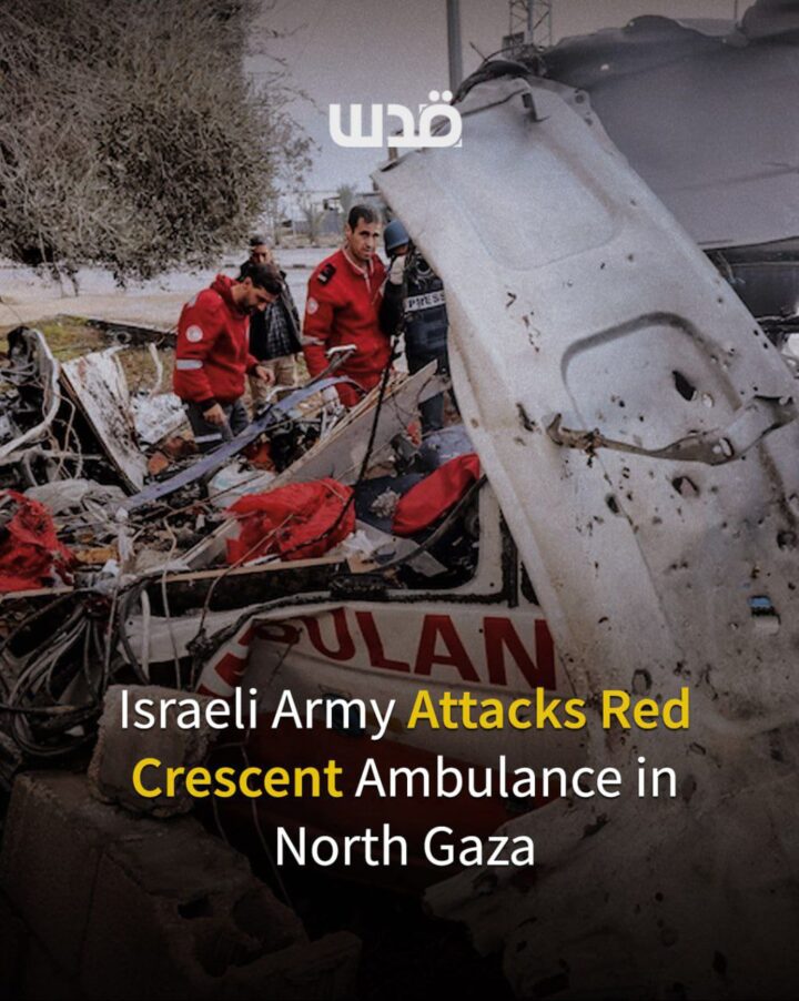 Un’ambulanza della Mezzaluna Rossa è stata colpita direttamente vicino alla rotonda di Zammo, a est di Jabalia, nel nord della Striscia di Gaza.