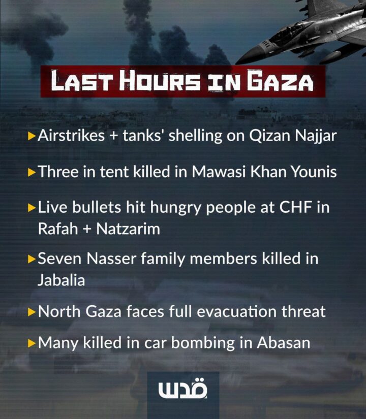 La cronaca delle ultime ore nella Striscia di Gaza: bombardamenti aerei e di artiglieria su Qizan Najjar; tre persone uccise in una tenda a al-Mawasi, a Khan Yunis, nel sud della Striscia di Gaza; proiettili letali hanno colpito persone affamate a Rafah; 7 membri della famiglia Nasser sono stati uccisi a Jabalia.