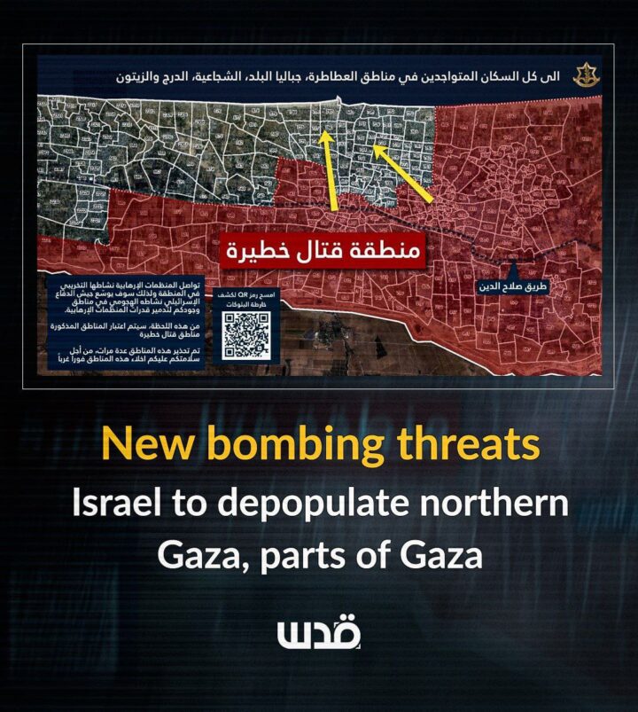 Dopo mezzanotte, l’esercito israeliano ha improvvisamente minacciato di bombardare le aree popolate del nord della Striscia di Gaza e della città di Gaza. Centinaia di migliaia di persone vi sono attualmente rifugiate. L’esercito ha minacciato intenzionalmente i civili a tarda ora per diffondere terrore e spaventarli.