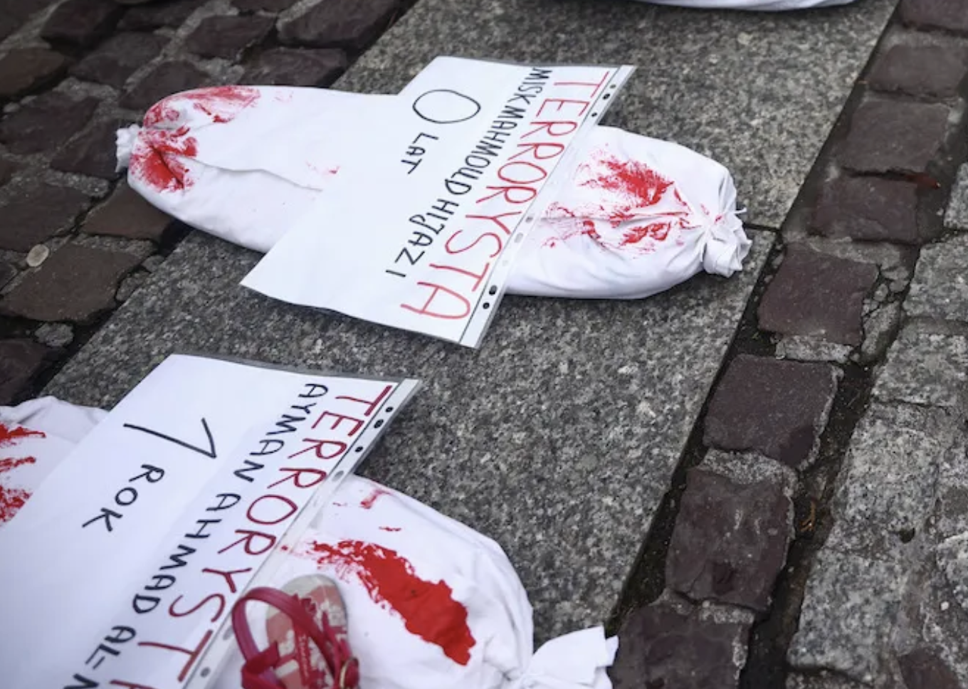 (Foto: fagotti che simboleggiano i bambini morti, esposti durante la manifestazione di solidarietà con la Palestina nella piazza principale di Cracovia, in Polonia, il 12 novembre 2023. [Beata Zawrzel/NurPhoto]).