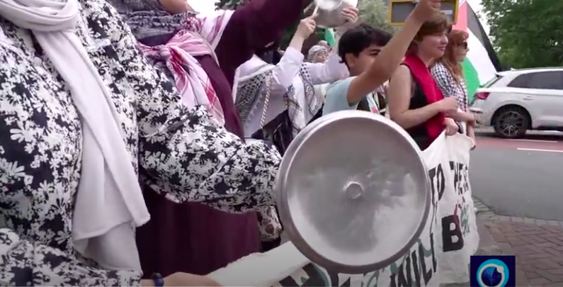 La protesta pacifica era piena di bandiere palestinesi, mentre i manifestanti cantavano e battevano su oggetti domestici come pentole e padelle. I manifestanti chiedevano che gli aiuti umanitari potessero entrare a Gaza e sollecitavano una maggiore pressione politica.