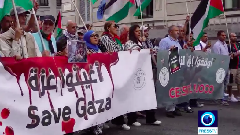 I filmati mostrano i manifestanti in marcia, sventolando bandiere palestinesi, tenendo cartelli con la scritta “Cessate il fuoco”, “Salvate Gaza” e “Palestina: esistere è resistere”, e cantando mentre la polizia sorvegliava l’evento.