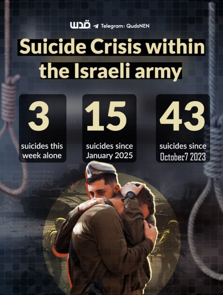 Territori palestinesi occupati. Quasi 50 soldati si sono tolti la vita negli ultimi mesi, tre soltanto questa settimana, nel contesto del genocidio perpetrato dal regime nella Striscia di Gaza assediata.