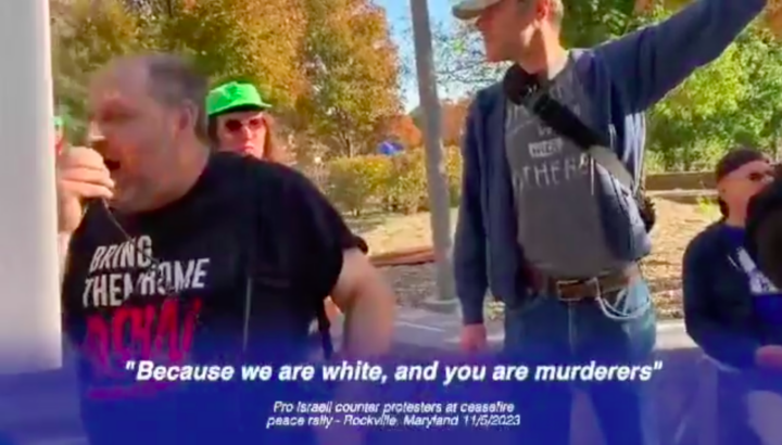 “America is ours… because we are white!”: L’America è nostra, perché siamo bianchi”, da una manifestazione pro-Israele a Rockville, nel Maryland.