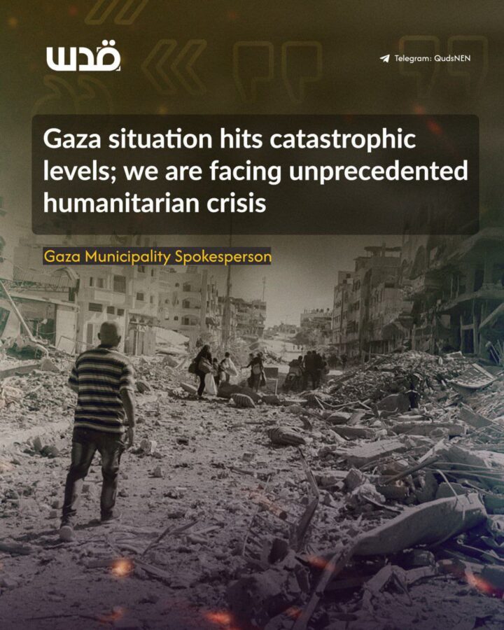 Gaza. Il portavoce del comune di Gaza riferisce che la situazione nella Striscia di Gaza ha raggiunto livelli catastrofici e che le persone stanno sopportando una crisi umanitaria senza precedenti a causa della mancanza di rifugi adeguati.