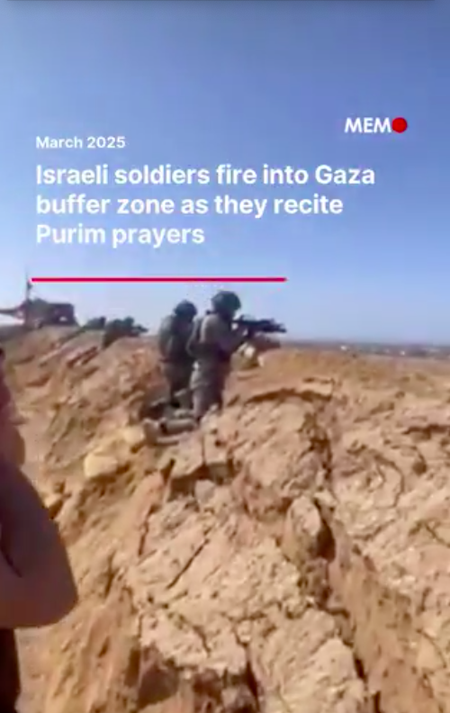 Gaza – MEMO. Un video mostra soldati israeliani che sparano nella zona cuscinetto di Gaza mentre recitano preghiere in ebraico associate alla festività ebraica del Purim. Il filmato, ampiamente condiviso sui social media, ha attirato le critiche di molti, che lo considerano un atto di provocazione nel contesto del blocco in corso e della crisi umanitaria a Gaza. Anche l’esecuzione di preghiere religiose ebraiche nelle azioni militari israeliane nel territorio palestinese ha sollevato preoccupazioni. Purim, una festività gioiosa che segna la liberazione biblica degli ebrei dalle persecuzioni, è tradizionalmente celebrata con letture dal Libro di Ester e include festeggiamenti e beneficenza.