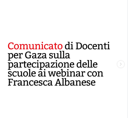 InfoPal. Publicamos dois comunicados sobre a grave situação antidemocrática e contra a liberdade de ensino e de expressão que envolve o Sistema Itália, agora plenamente inserido no novo Totalitarismo ocidental, implementado por meio de mecanismos de um governo cúmplice do Genocídio em curso na Faixa de Gaza e do Colonialismo de assentamento israelense na Palestina histórica. Enviar inspetores a escolas que organizaram encontros com a doutora Albanese, Relatora da ONU, portanto pertencente a uma organização internacional reconhecida pelo mundo inteiro, é motivo de grave inquietação pela deriva totalitária abraçada por nosso país.