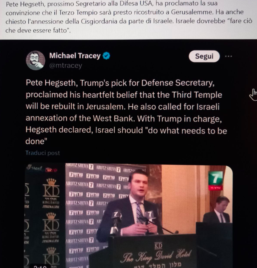 Dopo una visita in Israele per visitare i siti biblici nel 2016, Hegseth aveva dichiarato alla Jewish Press: “È la storia del popolo eletto da Dio. Questa storia non è finita nel 1776 o nel 1948 o con la fondazione delle Nazioni Unite. Tutte queste cose risuonano e contano ancora oggi”.
