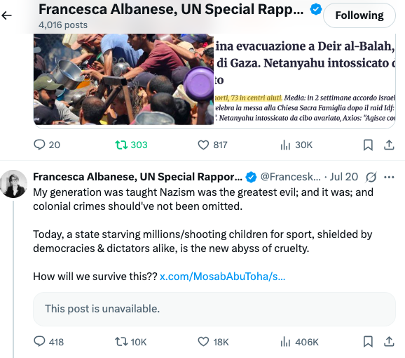 “Alla mia generazione è stato insegnato che il nazismo era il male più grande – e lo era – e che i crimini coloniali non avrebbero dovuto essere omessi”, ha scritto Albanese su X.