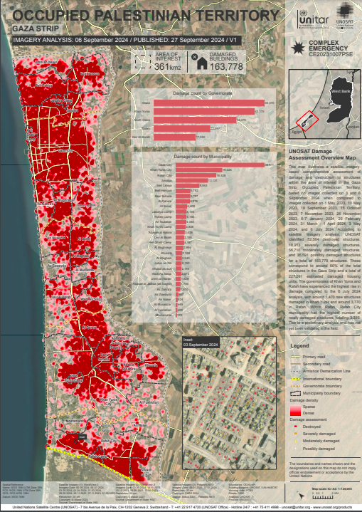 Confrontando le immagini recenti con i dati precedenti, l’UNOSAT ha fornito una panoramica completa dell’evoluzione della distruzione. Il rapporto indica che il 66% delle strutture, per un totale di 163.778, è stato colpito. Tra questi, 52.564 edifici sono stati distrutti, 18.913 gravemente danneggiati, 35.591 probabilmente danneggiati e 56.710 moderatamente colpiti.