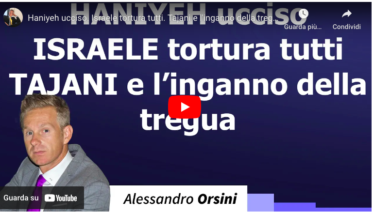 Di Alessandro Orsini. In questo video affronto quattro temi: 1) L’uccisione di Haniyeh a Teheran; 2) l’uso della tortura da parte d’Israele con particolare riferimento al caso recente avvenuto nel carcere di Sde Teiman; 3) Tajani e il modo in cui i mezzi d’informazione manipolano l’opinione pubblica attraverso il falso annuncio permanente della tregua imminente. Infine, polemizzo con alcuni miei detrattori incontrati a Rete 4 nell’ultima stagione di “è sempre carta bianca”.